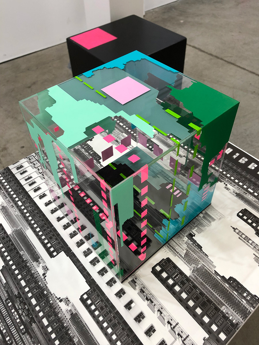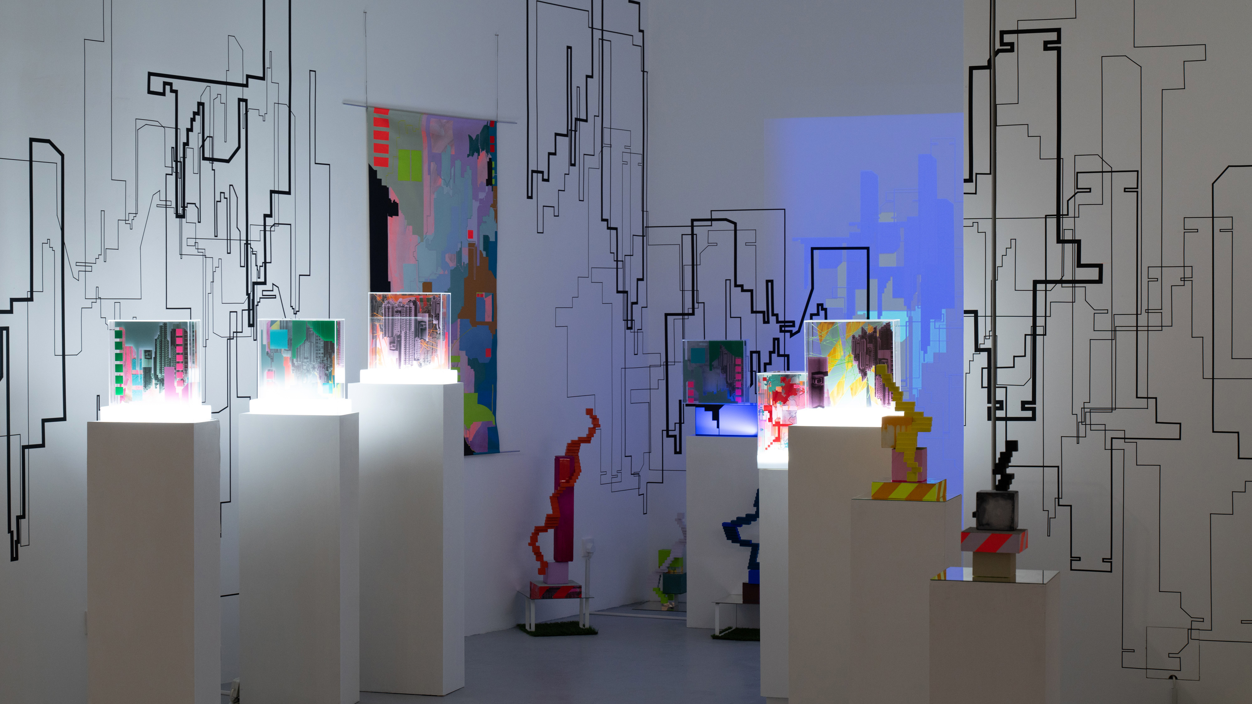 Acting as a mini survey of work created since relocating to Asia in 2014, Floating Cities… charts the development of a visual language entangled with the artist’s fascination with the seemingly infinite skylines of globalised megacities. It reflects a rapidly changing landscape with no horizon constantly in a state of flux; a landscape dominated by the digital, flooded with information and connected by unseen networks. Through this lens, Trevethan explores the impact of technologies on our perception of colour and space as well as how we process visual information.